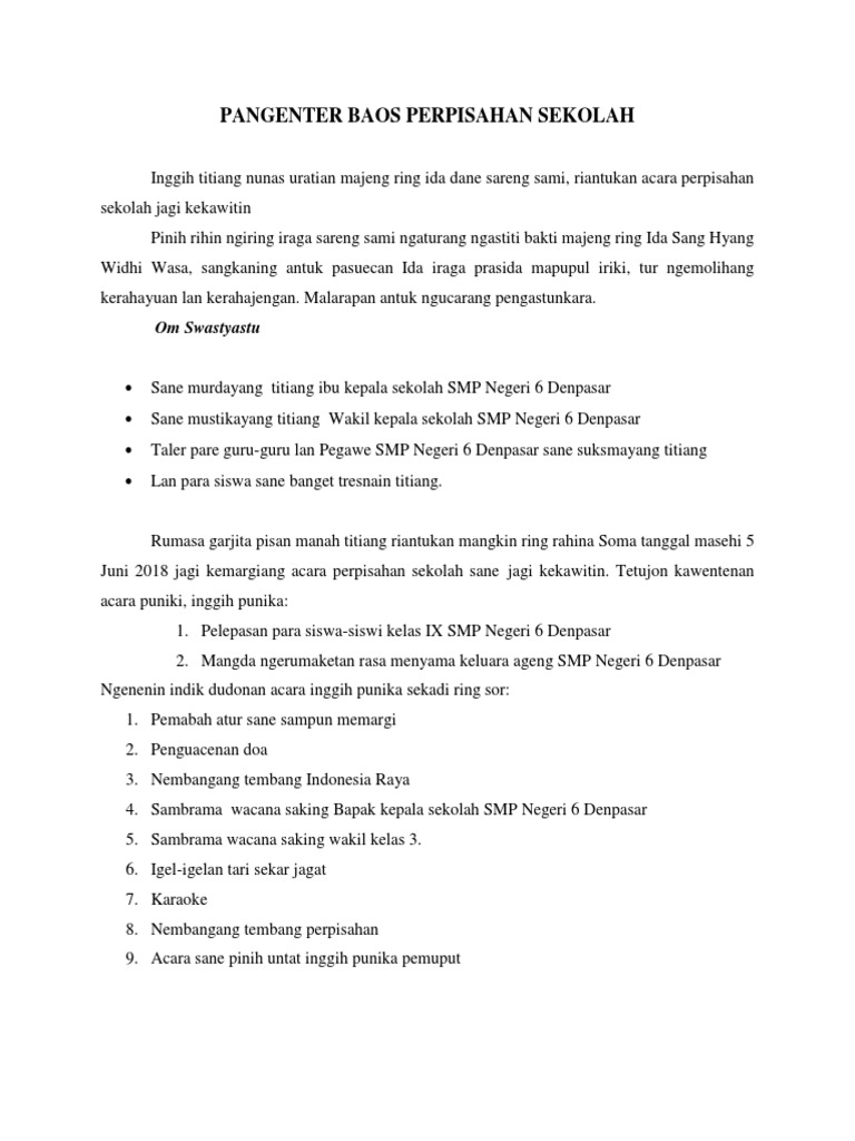 Contoh teks pembawa acara bahasa bali temanya tentang ulang tahun sekolah 1 Lihat jawaban hafilkim hafilkim Pangenter baos Ulang Tahun Sekolah Inggih titiang nunas uratian majeng ring ida dane sareng sami riantukan acara perpisahan sekolah jagi kekawitin. Satua Sampik Ingtai March 25 About Me. Contoh Teks Mc Bahasa Bali Singkat Berbagai Teks Penting.