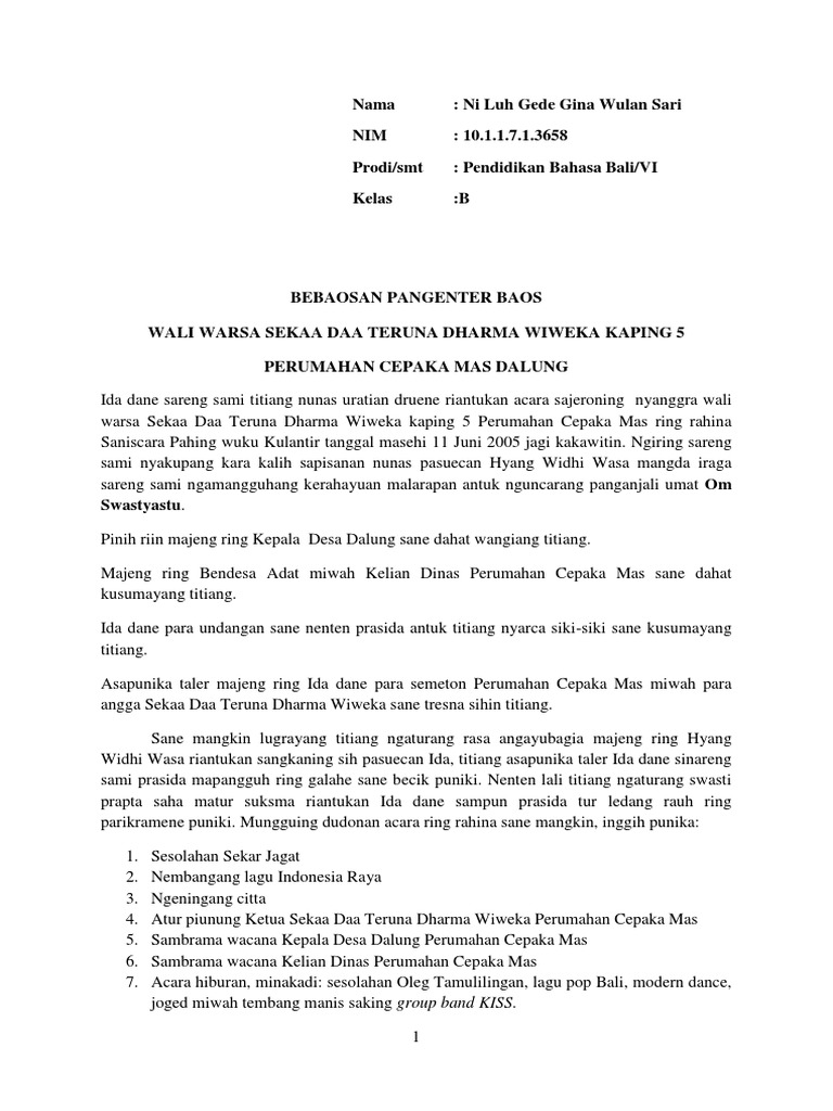 Nabi DOWNLOAD MC pembawa acara yening ring bahasa Bali kabaos. Pangenter Baos Wanti Warsa Seka Truna Brata Wangsa Br. Contoh Pangenter Acara Bahasa Bali.