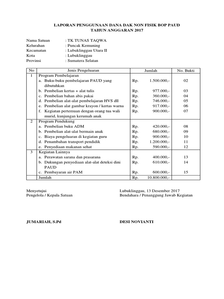 Contoh Format Laporan Penggunaan Dana Bop Paud Berkas Edukasi