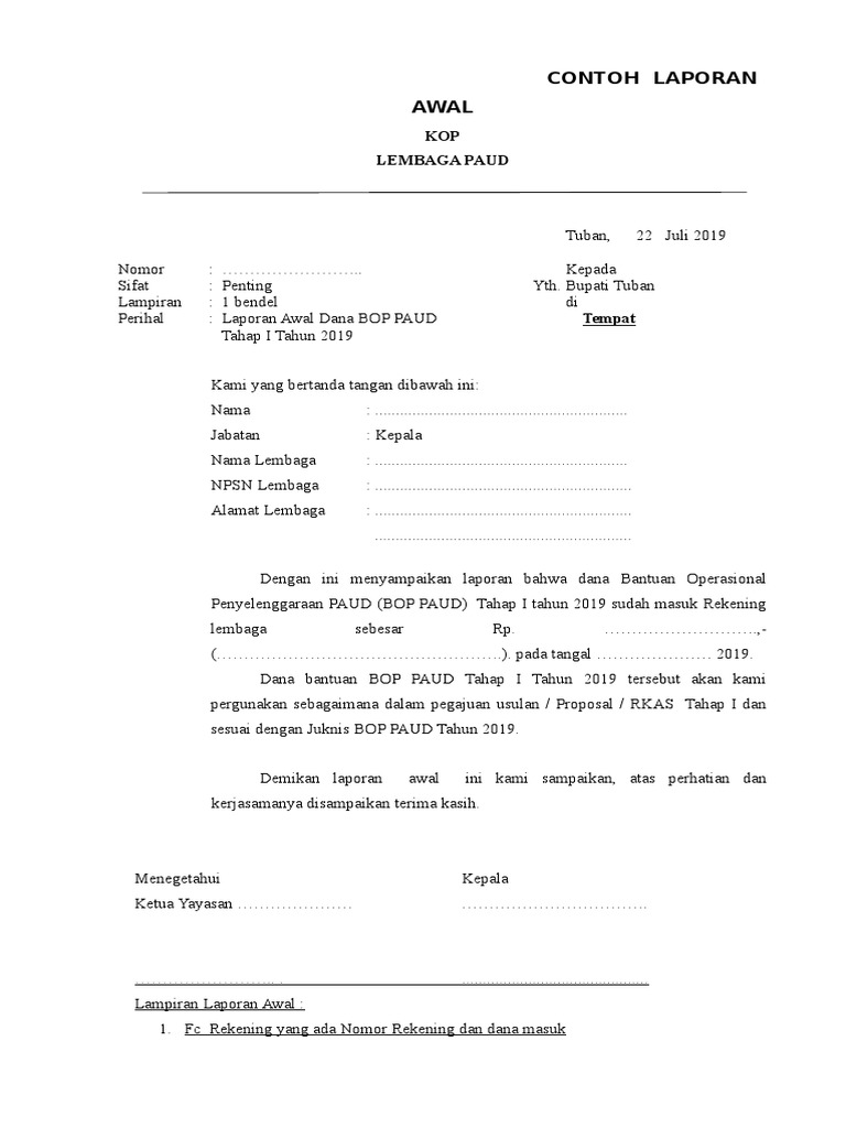 Pedoman pemmbuatan surat proposal pengajuan bop untuk paud yang berisi tentang surat pengajuan daftar pendidik jadwal harian kegiatan mengajarserta pembahasan lainnya. Arsip Contoh Format Laporan Penggunaan Dana BOP PAUD. Laporan pertanggungjawaban lpj spj bop paud tk kb ra tpa tahun 2017.