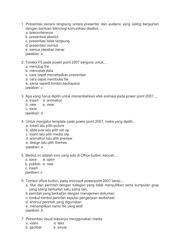 Slide sow lalu pilih set up c. Soal power point 2007 pilihan ganda beserta jawabannya apa yang harus dipilih untuk menambahkan efek animasi pada power point 2007 tombol office button pada microsoft powerpoint 2007 berisi cara menyimpan file power point 2007 melalui keyboard dengan cara menekan tombol untuk mengatur template pada power point. Membuat Animasi Pertama Anda.