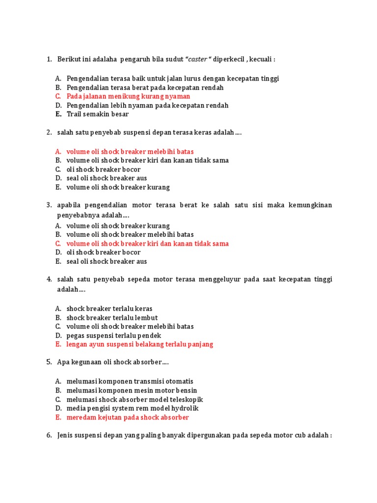 Berikut ini adalaha pengaruh bila sudut caster diperkecil kecuali. Pengendalian terasa baik untuk jalan lurus dengan kecepatan tinggi Pengendalian terasa berat pada kecepatan rendah. Lantas apa yang dimaksud dengan camber caster dan toe.